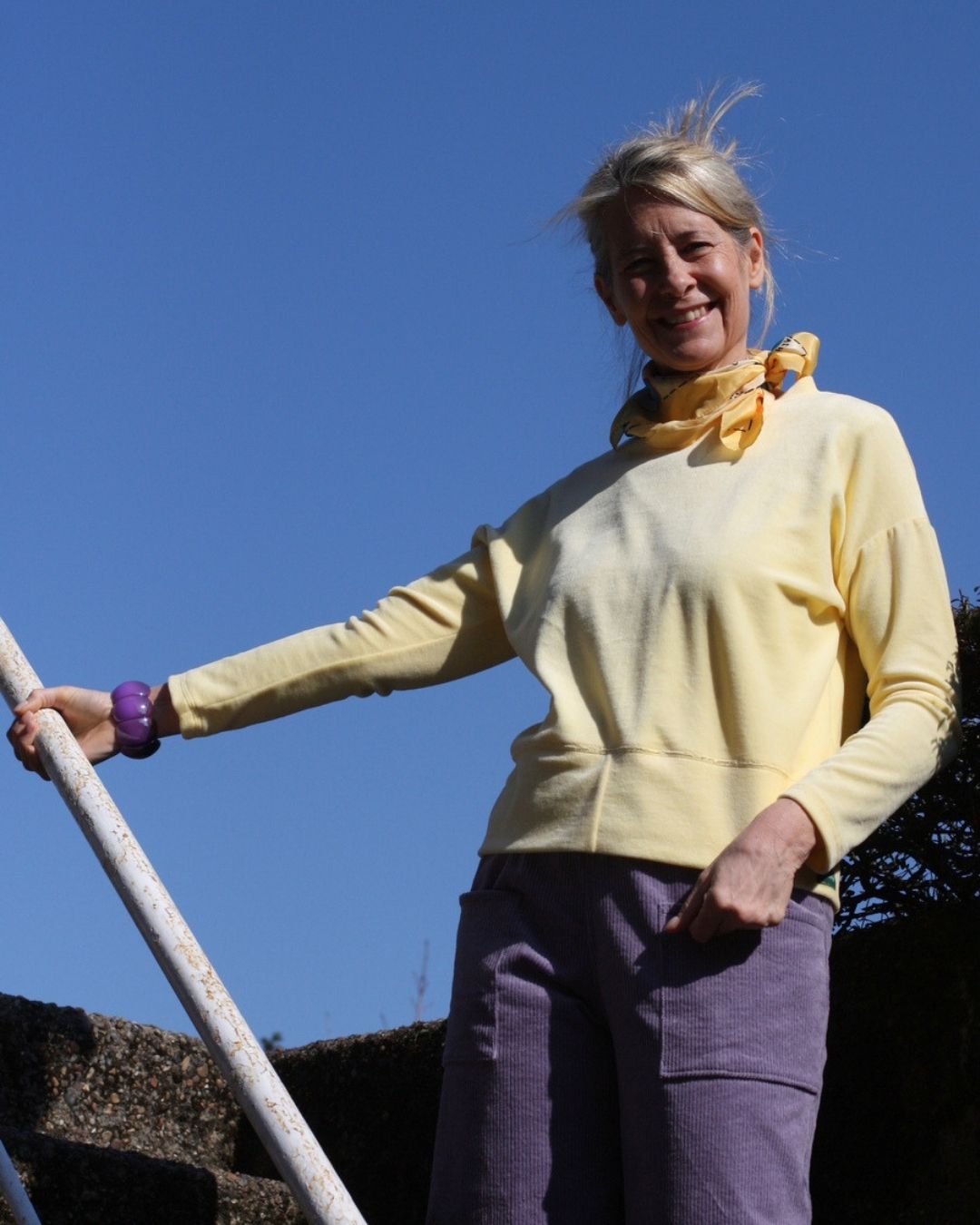 Trendiger Pullover aus einem weichen Nicki-Stoff mit einem kleinen Kragen. Moderner gerader Schnitt. Lässig und bequem für jeden Tag. Passt wunderbar zu unserer fliederfarbenen Cordhose oder unserem leichten Viskose-Rayon Rock Frühlingsblumen. Einfach ein „Must-have“ für die Saison.