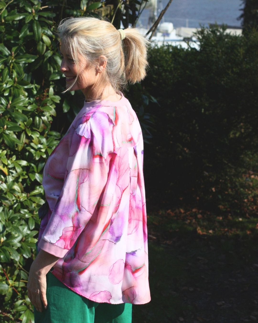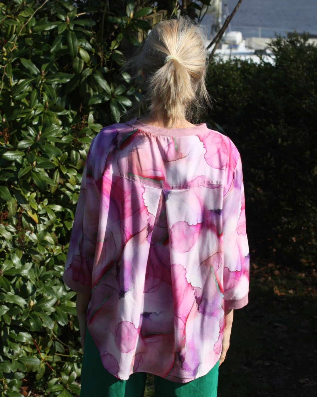 Viskose-Stoffe sind pflegeleicht. Waschen Sie bei niedriger Temperatur bis zu 30 Grad / Feinwäsche. Schleudern Sie nur leicht, mit 600 Umdrehungen oder weniger, so bleibt das Gewebe geschützt. Idealerweise trocknen Sie das Kleidungsstück liegend an der Luft, ziehen Sie es nach dem Waschen kurz in Form. Bitte nicht im Trockner trocknen.