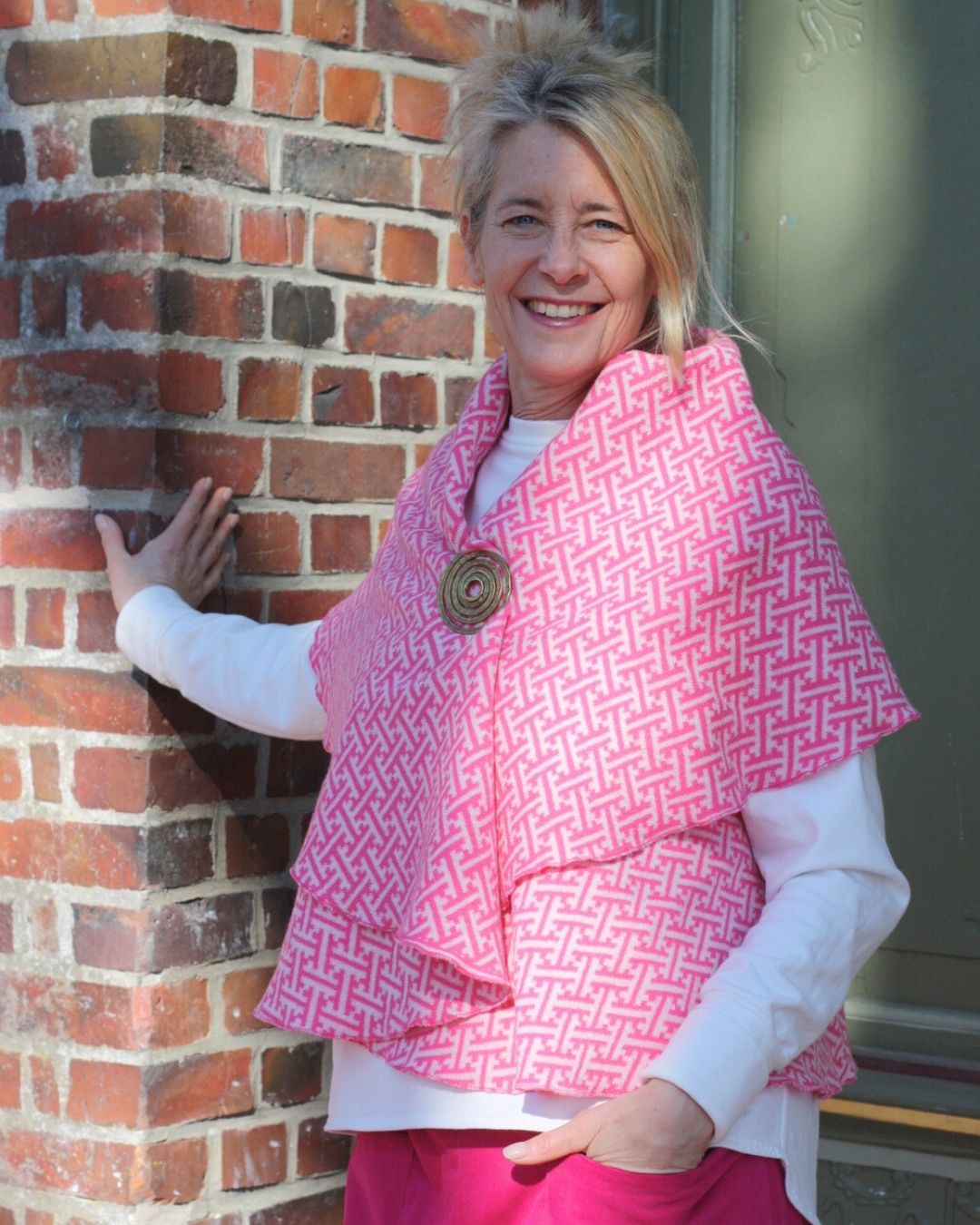 Eine wunderbare Wende-Weste Merino aus feiner Merinowolle mit einem einzigartigen Muster. Diese Weste können Sie drehen und wenden wie Sie wollen. Sie können sie als lange Weste oder als kurze Weste tragen. Zusätzliche kombinierbar mit einer Merino-Jacke – ein lässiger Look . Wir empfehlen als Verschluss unsere Rundspange – Sie finden sie unter Accessoires/Rundspange.